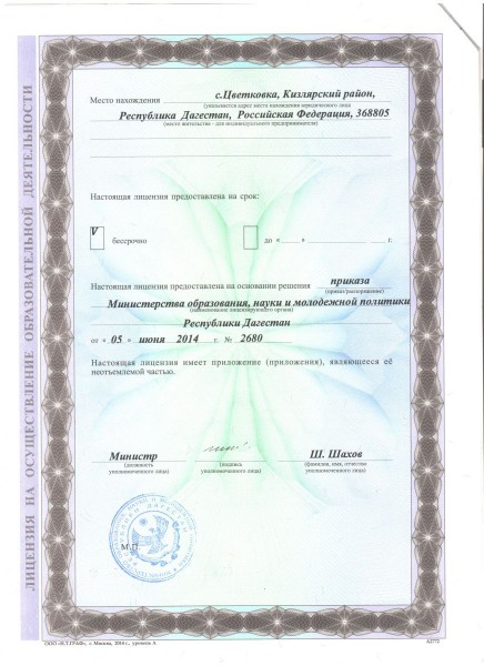 Адрес местонахождения образовательной организации* 368805, РД, Кизлярский район, с. Цветковка, ул. Ленина 6